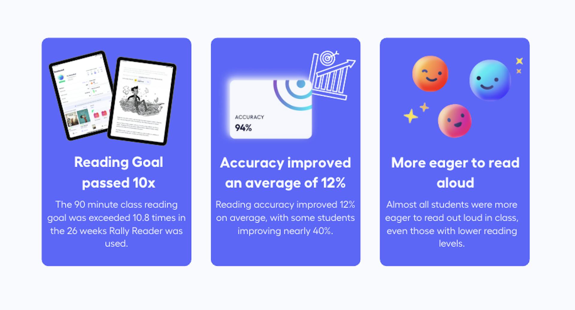 Rally Reader eliminates several barriers to literacy, including limited book access, varying levels of reading readiness, and the challenge of teacher capacity in busy classrooms by delivering a vast, adaptive digital library directly to students. Its built-in reading support reduces anxiety, builds confidence, and encourages consistent engagement. The results were striking: students in Perez’s class read more accurately, progressed faster, and surpassed their collective reading goal of 90 minutes per week more than ten times during the school year. Their success illustrates the powerful impact of accessible, student-centered literacy tools.