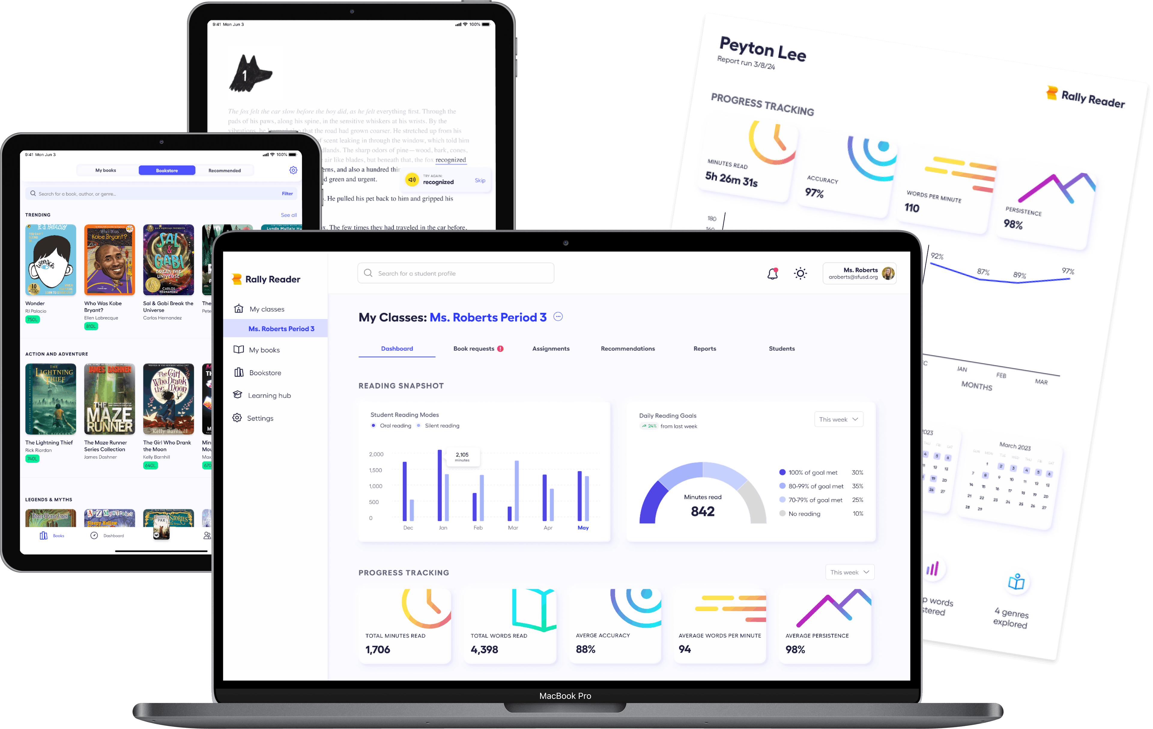 For the first time, teachers can get a comprehensive, quantified view of each student’s reading progress. The Rally Reader app tracks every word read, and offers teachers a detailed web-based dashboard with individualized data. This valuable insight helps teachers spot trends and use data-informed instruction to boost phonemic awareness and fluency skills. Plus, Rally's data-rich reports can be printed and shared with families, giving them the tools to support and encourage independent reading at home.
